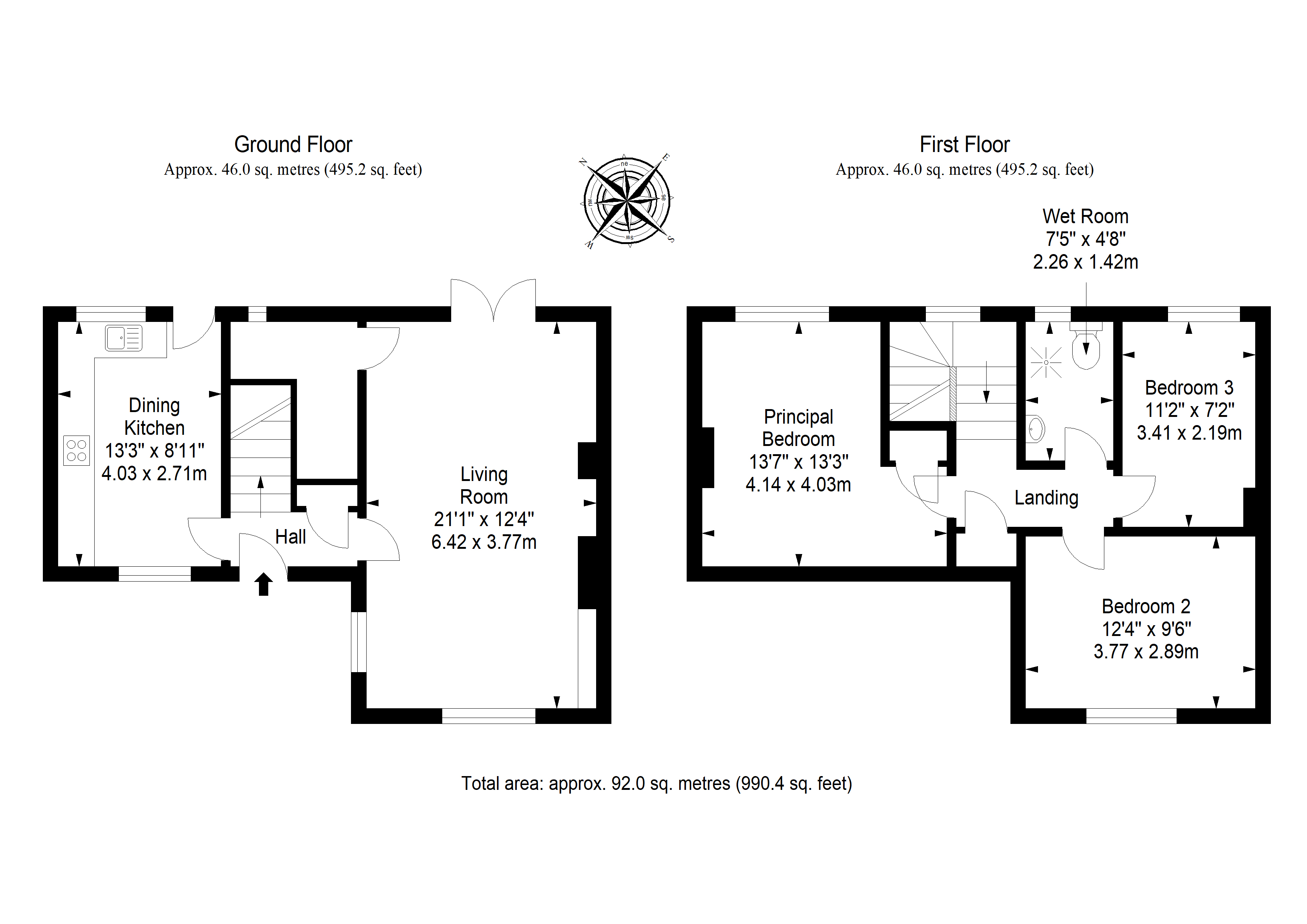 Upstairs, the home offers three bedrooms, including a generous principal bedroom with built-in storage. Two further bedrooms (one south-facing) provide versatile options for children, guests, or home working. Completing the first floor is a practical wet room incorporating a shower area, WC, and wash-hand basin.